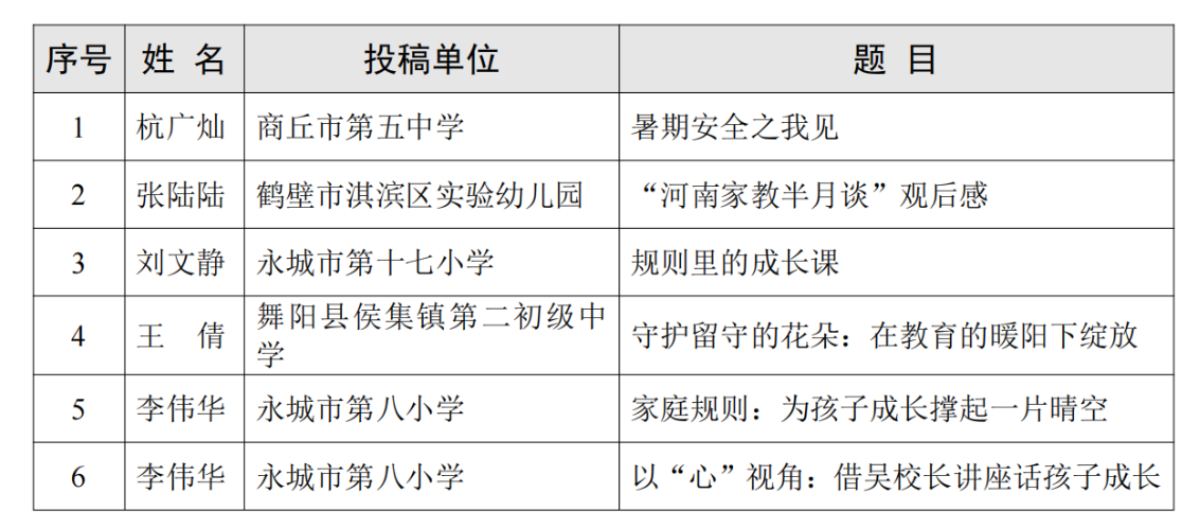 “河南家教半月谈”自2024年1月1日开播以来,浏览量近千万,广受家长欢迎。2025年1月,“河南家教半月谈”观后感征文活动正式启动,7月份收到稿件22篇,或聚焦自身关切谈学习体会,或分享育儿经验,内容丰富,言语真切。经专家组认真评审,评出杭广灿、刘文静、王倩等观众撰写的6篇文章为优秀征文,现予公布: