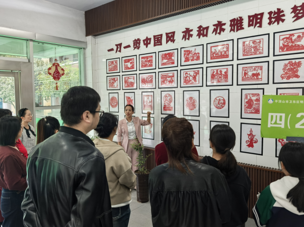 在贾梦欣主任的带领下,家长们开启校园探访之旅——从崭新明亮的新建升旗台,到充满艺术氛围的一楼剪纸展厅,学校每一处环境升级与文化建设成果都清晰呈现。尤为暖心的是,学校党支部书记、校长许晓慧热情接待,结合展厅内的学生剪纸作品,详细讲解学校特色剪纸教学的理念与丰硕成果,从课程设计到学生作品背后的成长故事,从刚刚结束的卫东区“一校一品”特色文艺演出活动中,学校师生参演的《非遗云肩剪纸情景舞剧——剪云织梦》节目,到对孩子各种能力的培养,内心的震撼、感悟等,使家长们深刻感受到学校对孩子们美育素养的用心培育,现场不时响起赞赏的掌声。