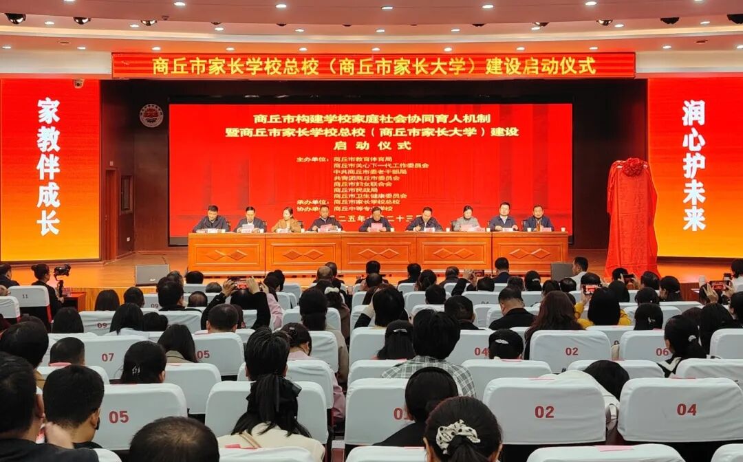 2025年10月23日,“商丘市构建学校家庭社会协同育人机制暨商丘市家长学校总校(商丘市家长大学)建设”启动仪式在商丘中等专业学校举行,市关工委主任庄敬山,市委教育工委副书记,市教育体育局党组书记、局长王新胜,市委组织部原副部长、市委老干部局原局长王培富,市委老干部局副局长张锦,共青团商丘市委副书记蒋冲,市妇联二级调研员刘素梅,市民政局三级调研员张海涛,商丘中等专业学校党委副书记、校长赵宏斌等有关领导以及各县(市、区)教体局、市直学校有关人员和商丘市中小学家庭教育讲师团全体成员200多人出席活动,共同见证“商丘市家长学校总校(商丘市家长大学)”揭牌,标志着商丘市家校社协同育人工作进入新的阶段。