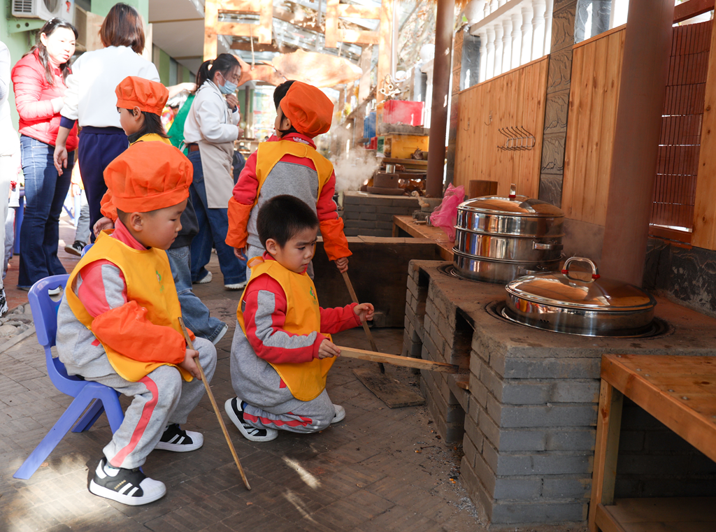 综合运动区里,安吉梯、滚筒、软梯等材料成为幼儿的 “创意道具”,他们自主规划玩法、协作完成挑战,在跑跳攀爬中锻炼肢体协调性与规则意识。楼顶户外游戏区再现 “猫抓老鼠”“跳皮筋”“城门城门几张高” 等经典民间游戏,幼儿的欢笑声与家长的回忆共鸣交织,让传统游戏成为连接两代人童年的文化纽带。田园驿站中,幼儿专注剥玉米、切分水果、描绘木瓜纹理,在与自然的互动中感知生命节律,培养观察力与动手能力。四时咕噜栈内,推磨声、欢笑声与南瓜、芋头的香气相融,幼儿在真实劳动场景中体会食物来之不易,传承勤俭节约的生活美德。